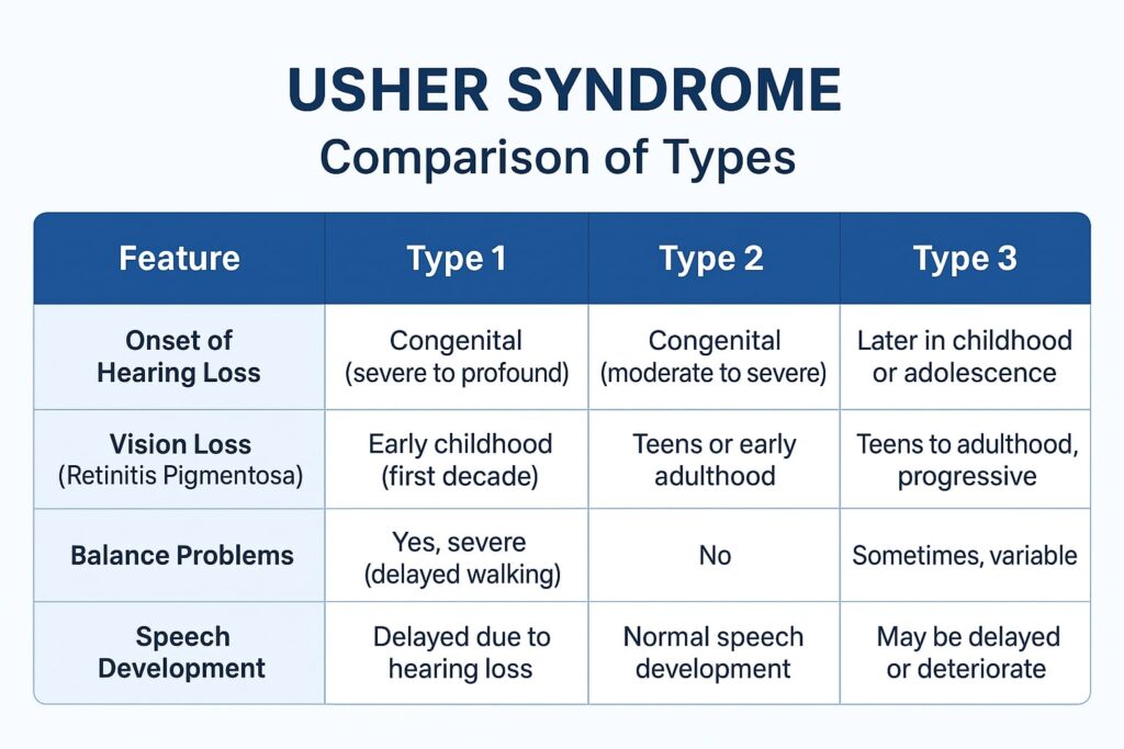 Type 1 | Profound, congenital (from birth) | Early childhood | Yes (vestibular dysfunction) | Children often delayed in walking; early blindness risk. |